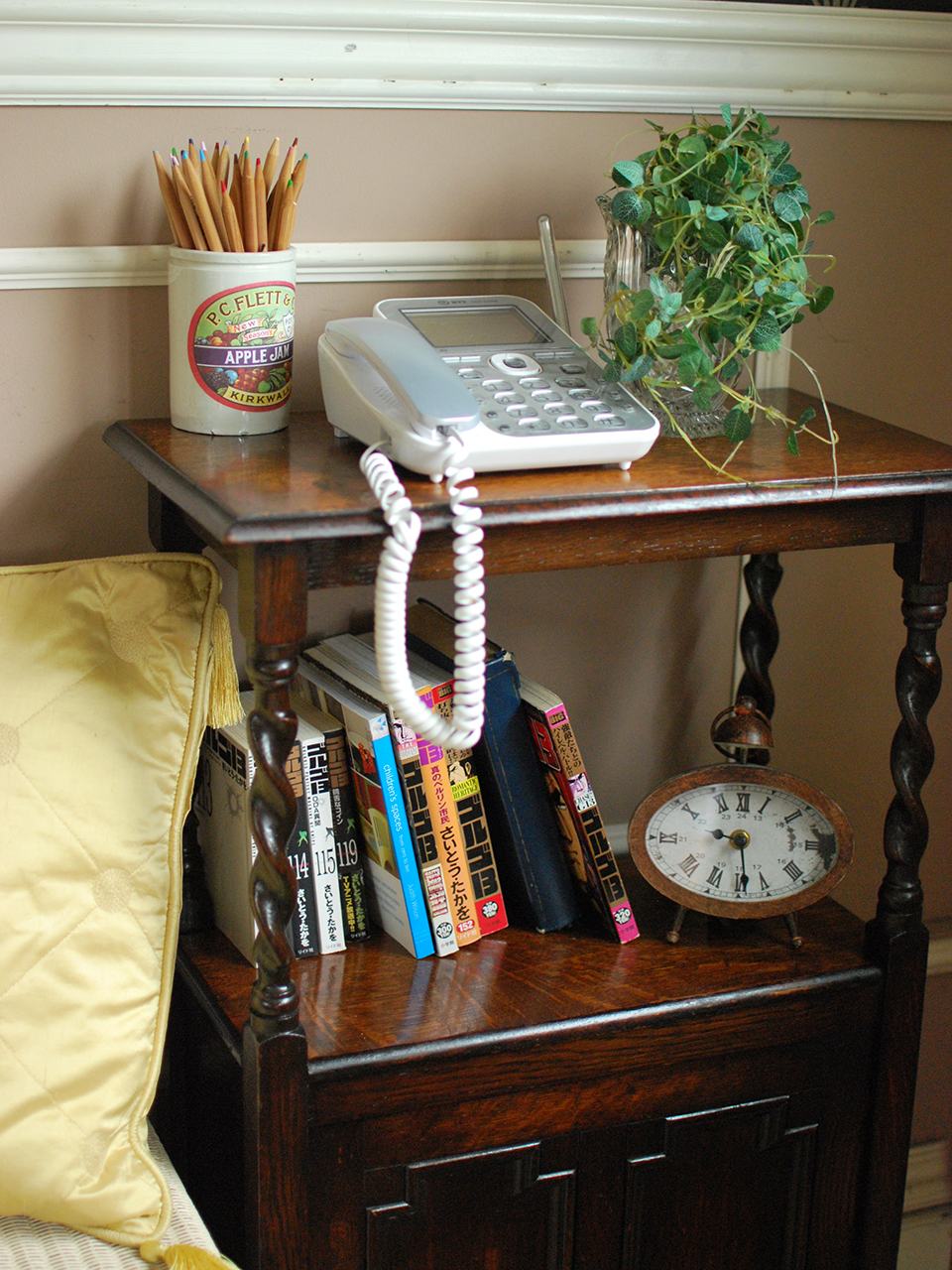 ちょっとめずらしい形をしたキャビネットは、電話台として使ってみました。