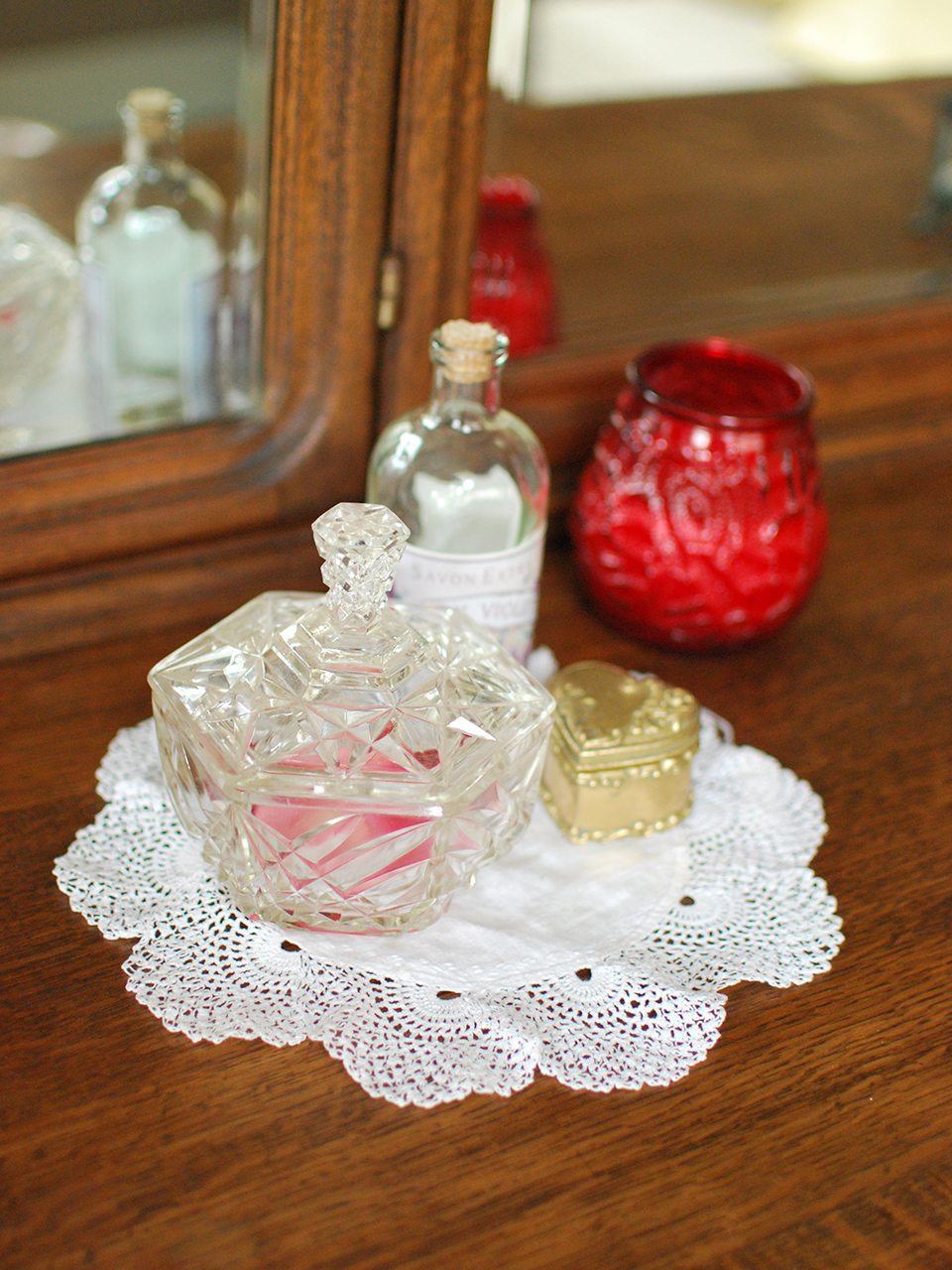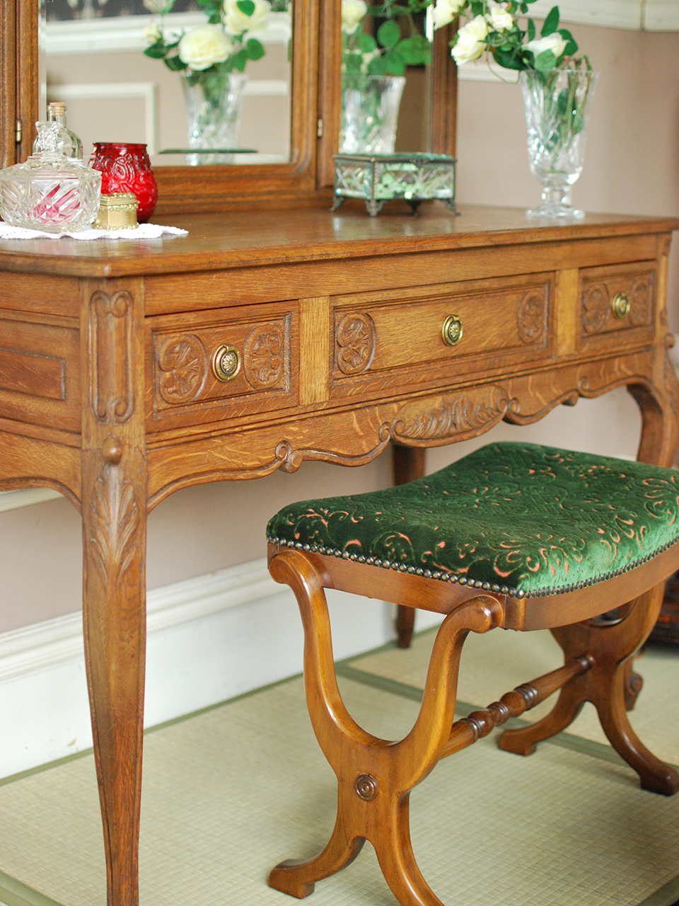 フランスらしいエレガントなドレッシングチェストに、グリーンのスツールを合わせて・・・