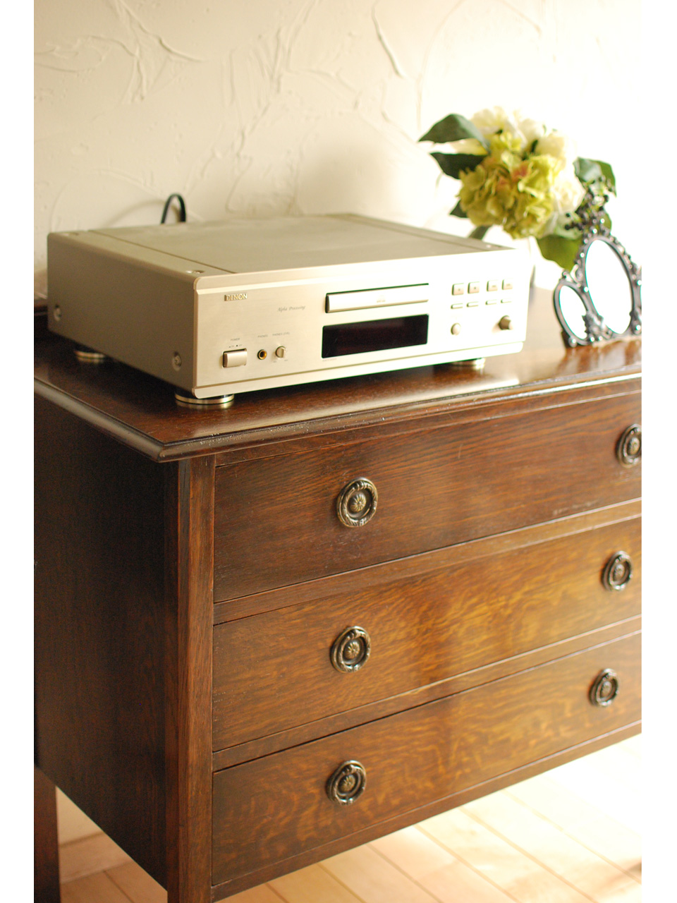 シックなオーク材のチェストの上に、オーディオ機器を。