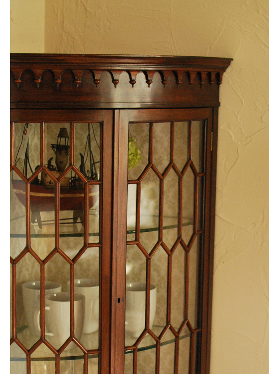 ガラス面の模様が美しすぎるシノワズリーデザインのコーナーキャビネット。